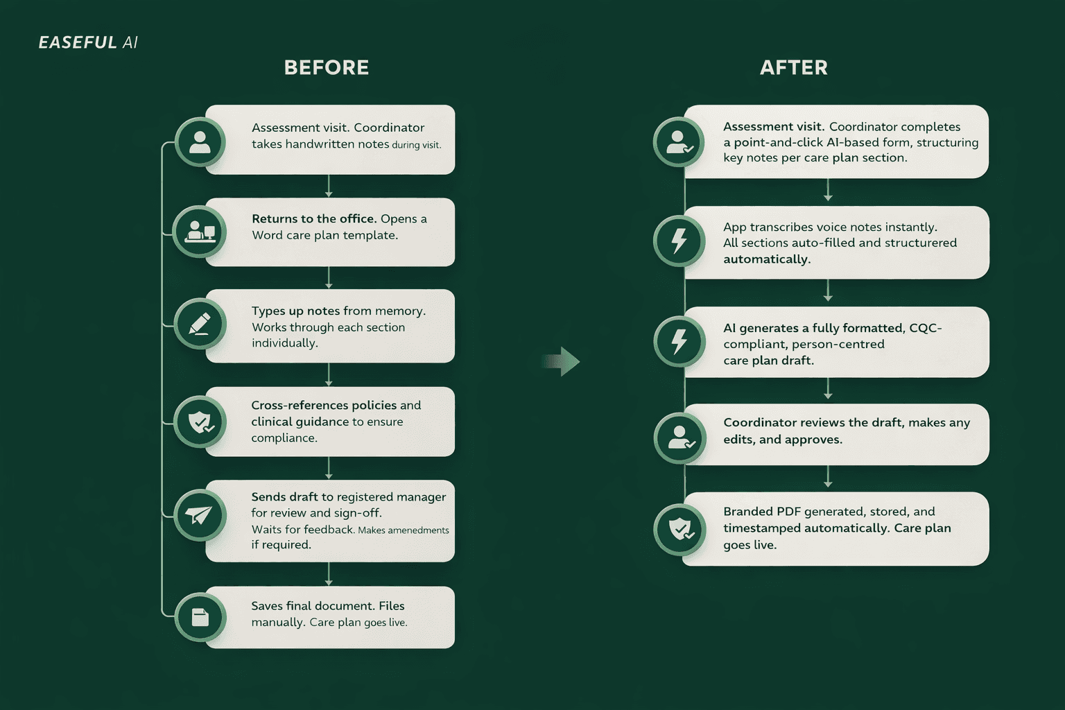 Maple Brook Care had a team of experienced coordinators who were genuinely good at their jobs. But every time a new service user came on board, the same exhausting process began. A coordinator would visit, take handwritten notes, and return to the office to build a care plan from scratch. Working through a Word template section by section, typing from memory, pausing to cross-reference policies, then chasing a senior manager to review and sign off before the plan could go live. On a straightforward case, it took three hours. On anything more complex, it took the better part of a full working day. With 47 adults to support and referrals increasing, incomplete care plans were sitting in draft for days. Service users were starting their care without a live, signed-off plan in place. That is exactly the kind of gap a CQC inspector looks for.